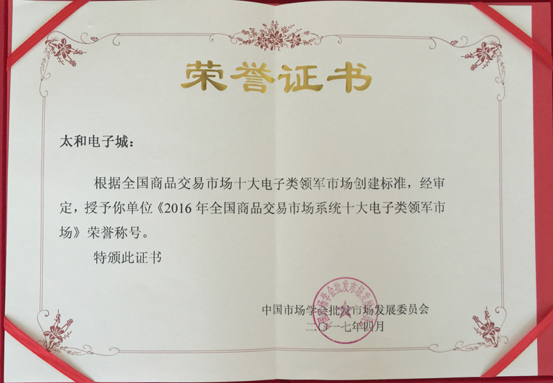 非凡国际电子城荣获 2016年天下商品生意市场系统十大电子类领军市场